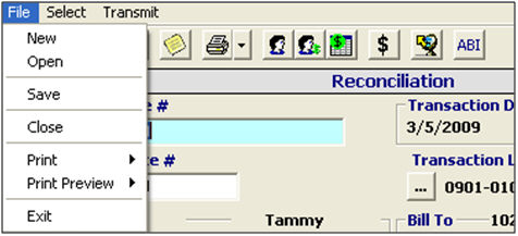 You’ll want to begin by getting familiar with the menu options on the main screen of the Reconciliation module. Once you’ve created your complete reconciliation, you will return to this transaction screen to perform the transmissions associated with the Recon transaction. Completing your Reconciliation transaction may require that you review some other portions of this manual, in order to become familiar with other modules of SmartBorder (ex. Billing).