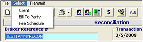 Open the client pick-list, which will allow you to search for and select the bill-to party for this reconciliation transaction. You can also do this by clicking the ellipsis in the bill to party field. |