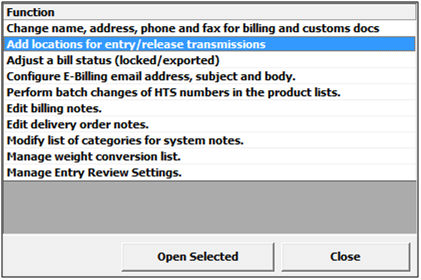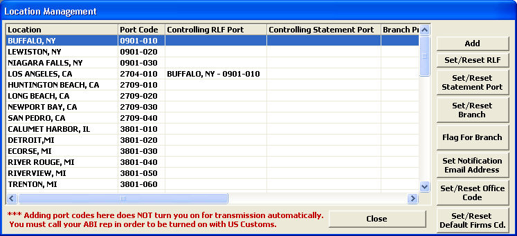 This option allows managers to add and edit locations for transmissions in SmartBorder. This menu is also used to set ports for RLF, controlling statement, and branch features. You will want to ensure that your customs representative has "switched on" for any new ports, before transmitting remote entries for that port.
